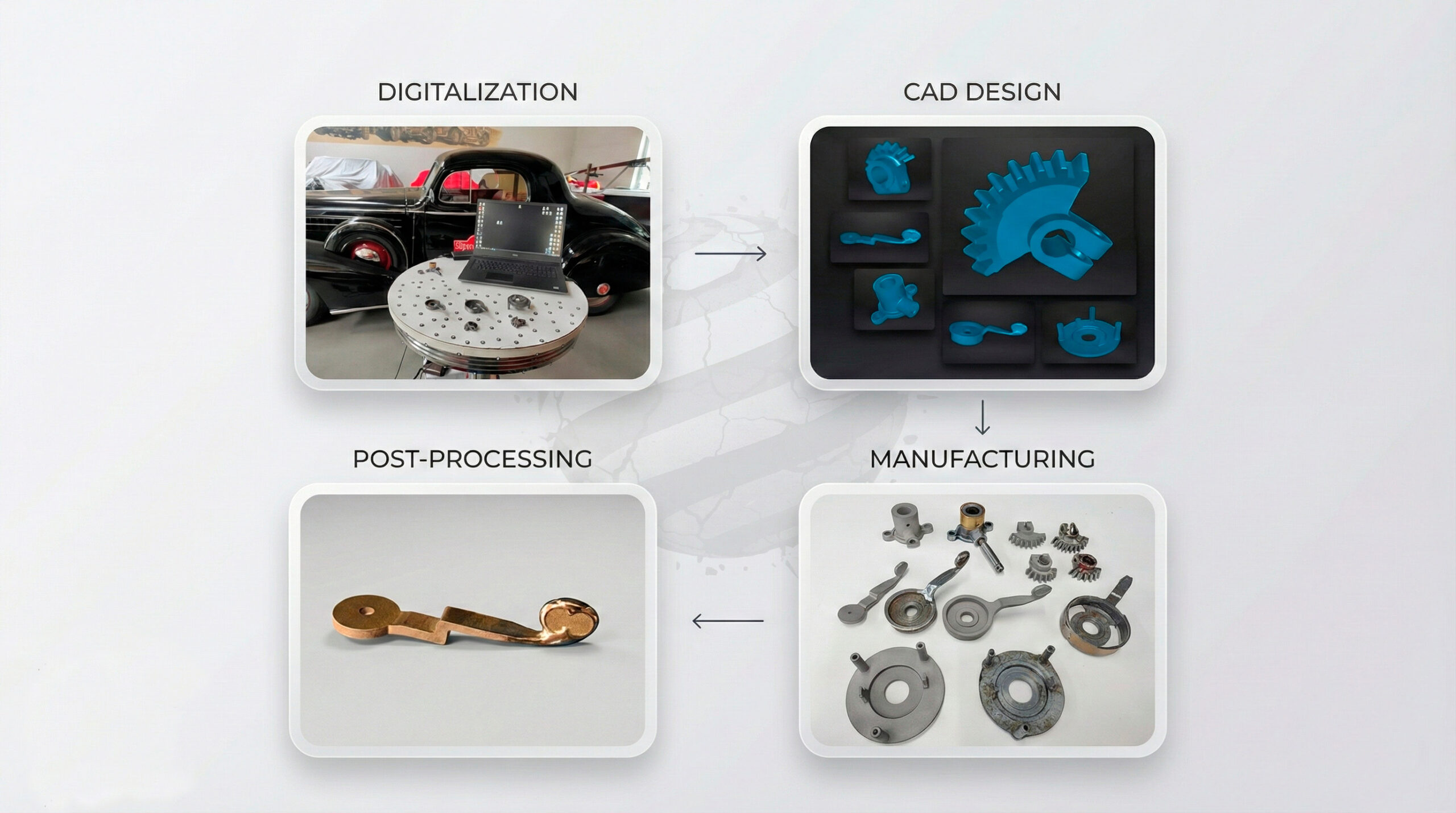 En este caso de éxito de ingeniería inversa nos encontramos con varias piezas descatalogadas de un coche clásico, algunas incluso rotas o incompletas, sin posibilidad de recambio. A partir de las piezas originales, digitalizamos la geometría, reconstruimos un CAD limpio y definimos las zonas críticas para asegurar el encaje y la resistencia. Para la fabricación final utilizamos impresión 3D en metal, lo que nos permitió reproducir componentes complejos y devolver el vehículo a servicio con piezas nuevas, fiables y ya documentadas para futuras unidades.